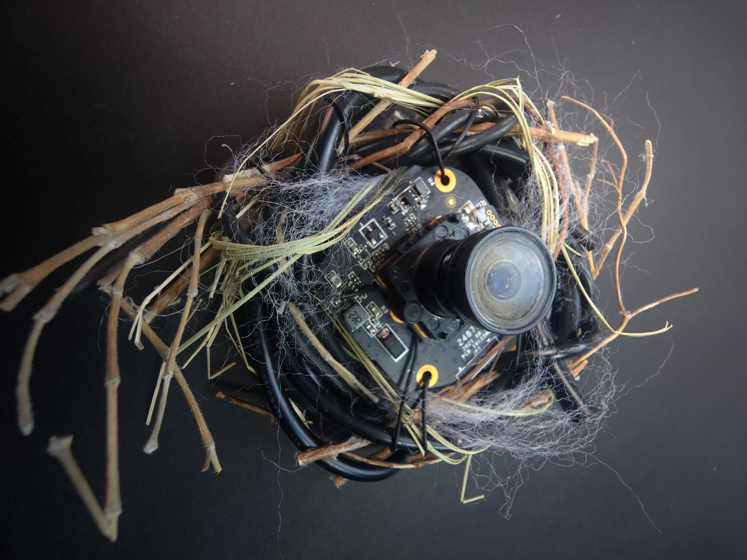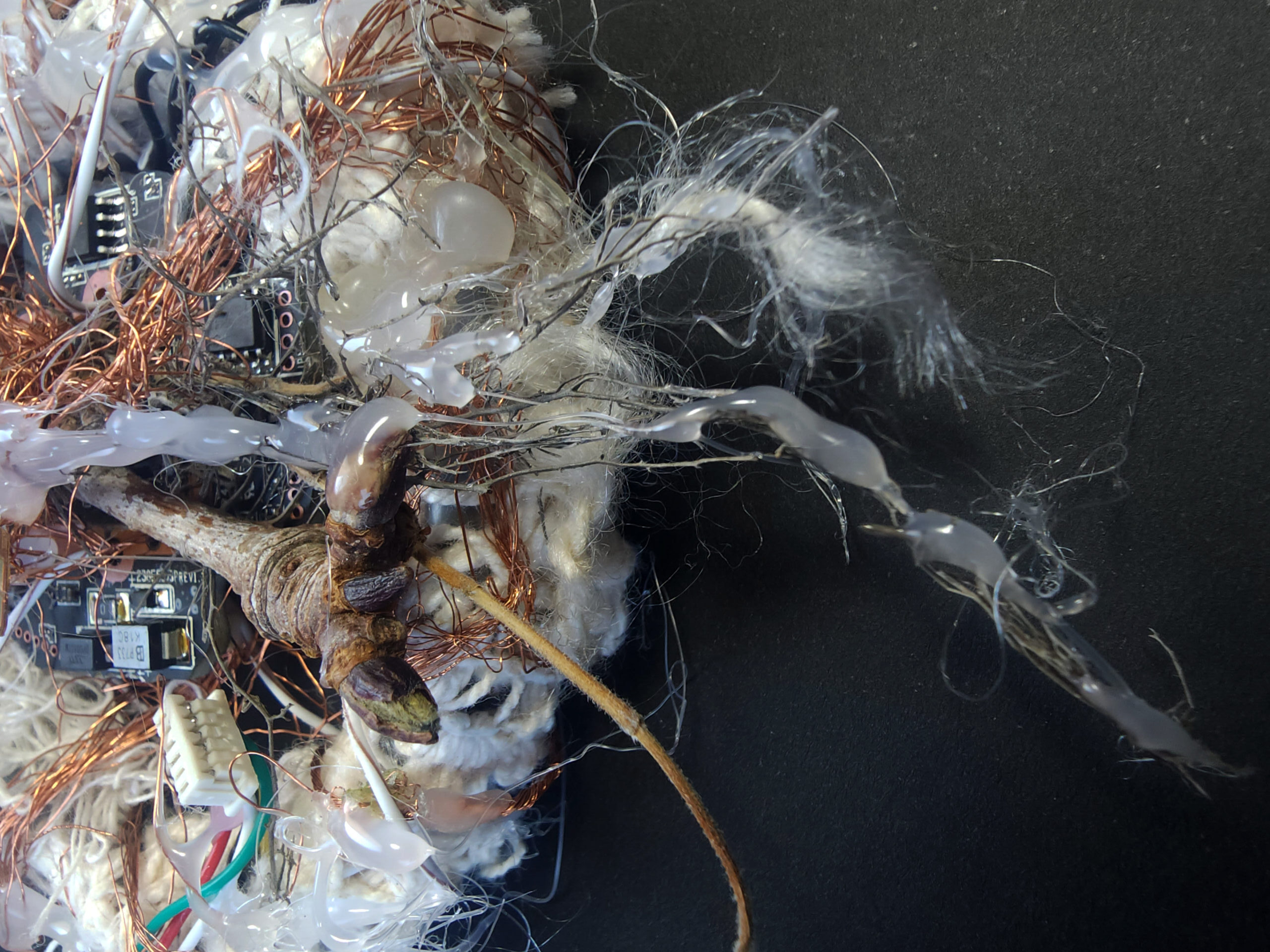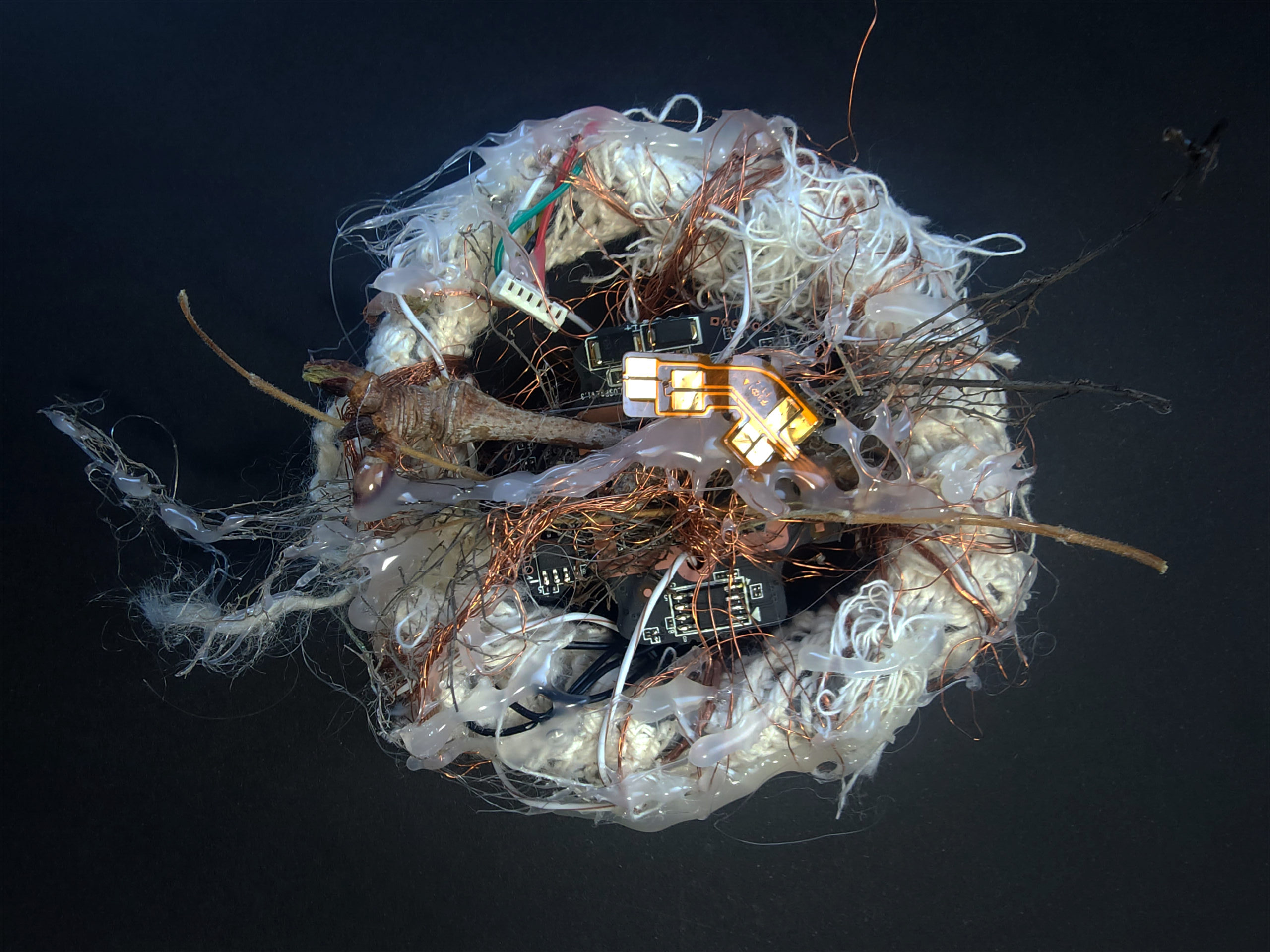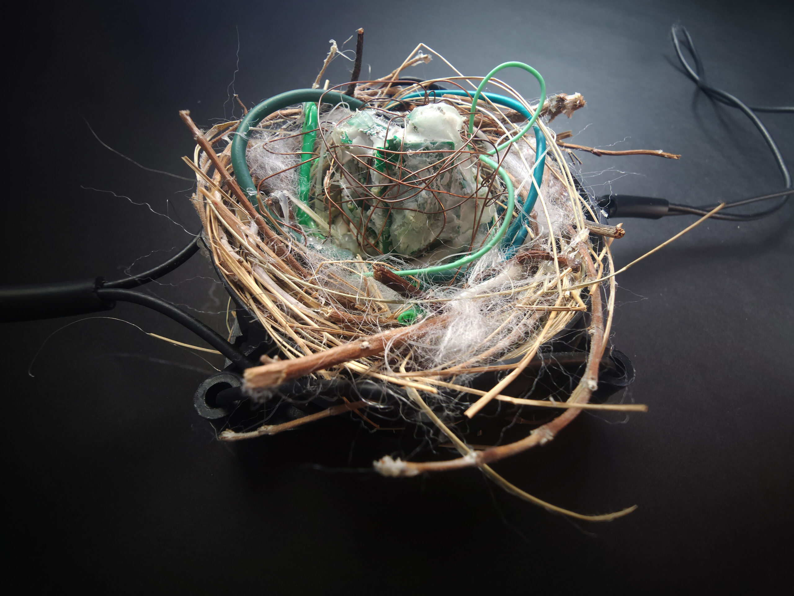 Un nido obsolescente es una experiencia artística performática conformada por piezas que cumplen una función ambivalente de vestimenta-joya, que dialogan acerca de la obsolescencia, problematizando en torno a las fronteras, puntos de encuentro e hibridación entre lo natural y lo artificial.